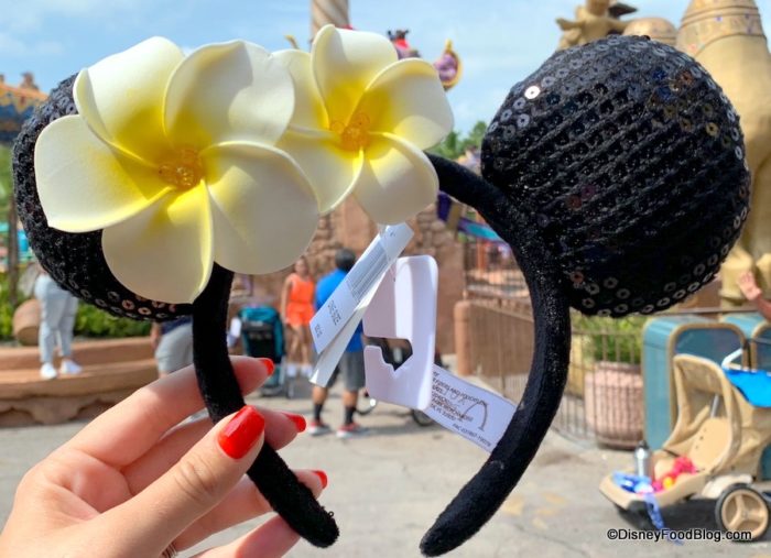 These are the Aulani Ears, initially sold at the Disney resort located on the Island of O’ahu. The flowers resemble plumeria, and the three-dimensional look of them is soft and pretty — just like the plumeria flower itself!
