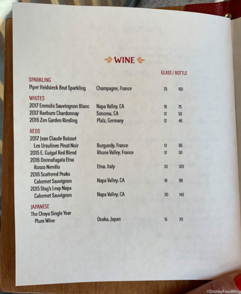 Currently, there’s no Disney Dining Plan redemption option available, but annual passholders and DVC members can get a 10% discount, and Tables in Wonderland members and cast members get 20%. We were told that you can’t use a discount on the tasting sampler, but we did the math and it seems like we did get the discount on it.