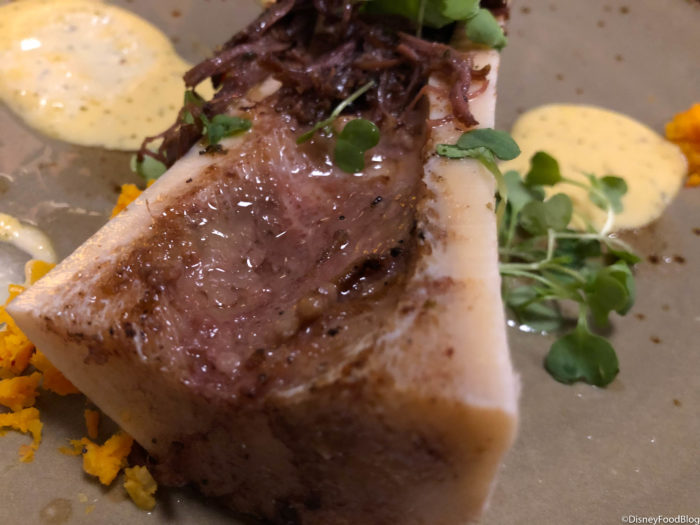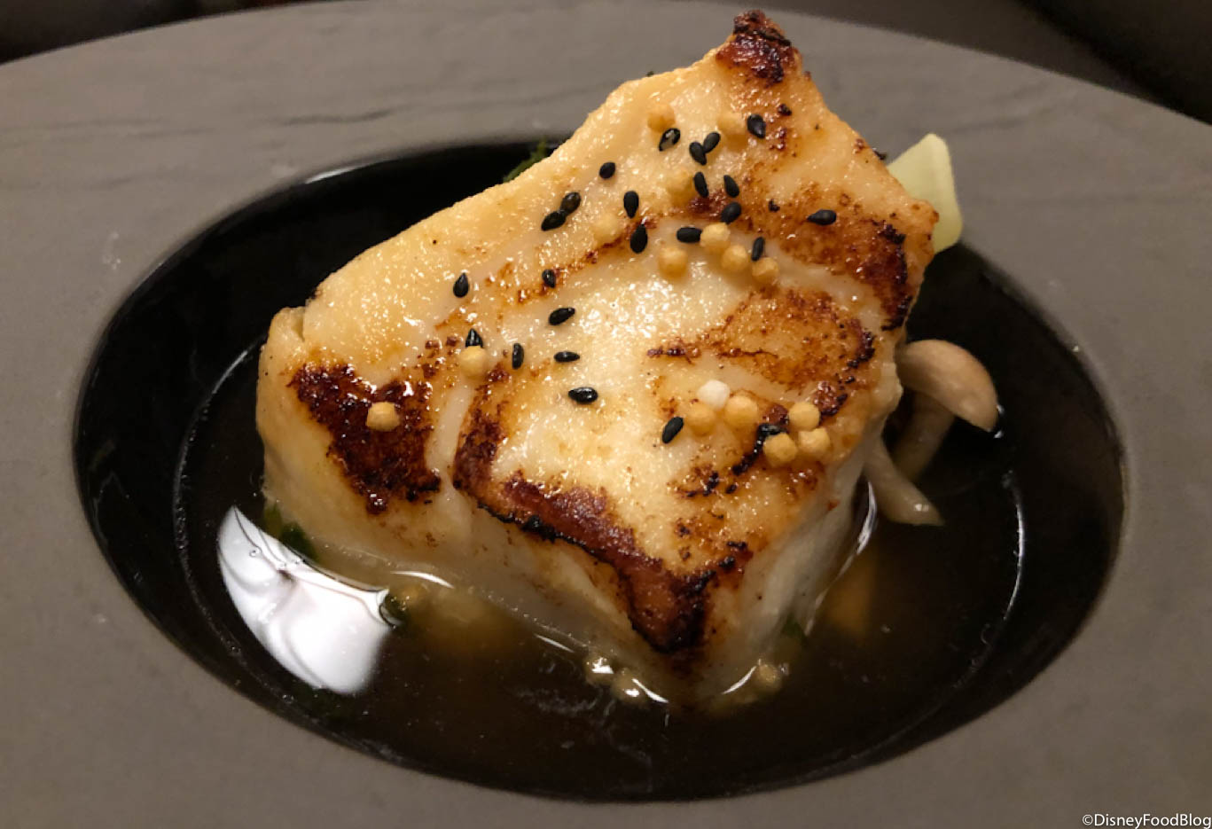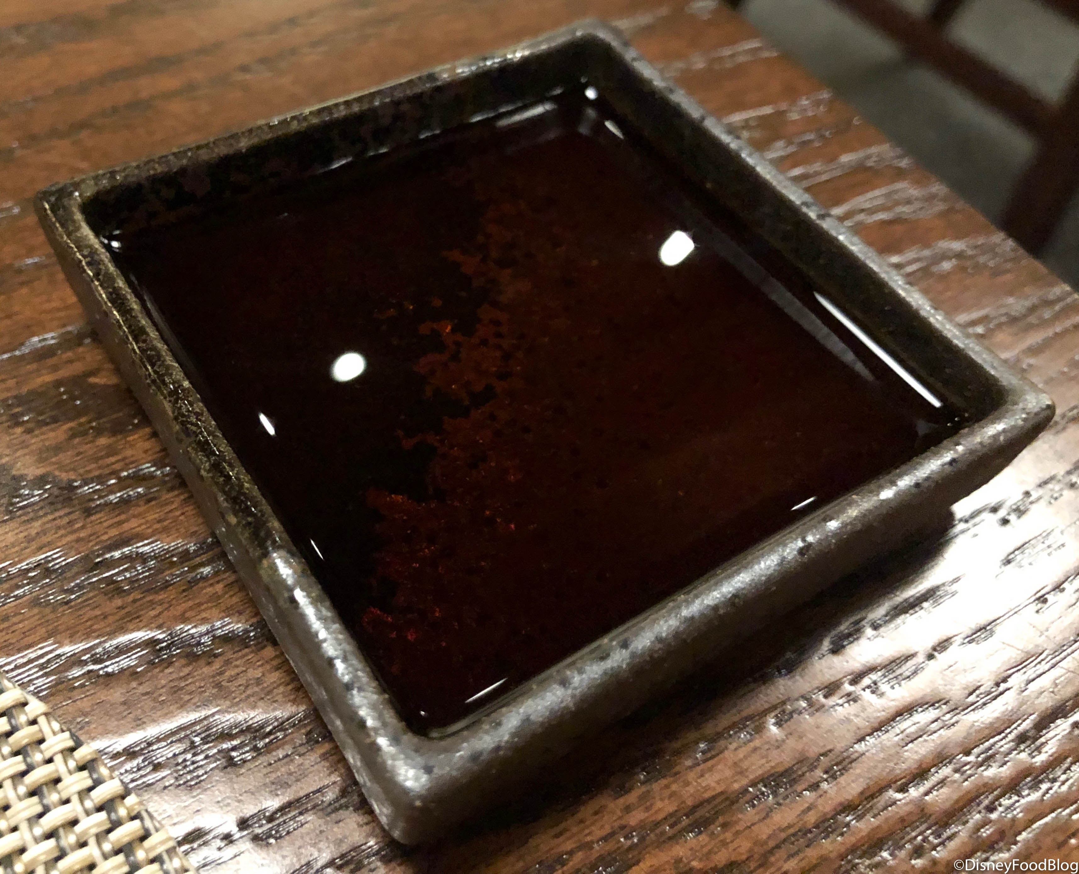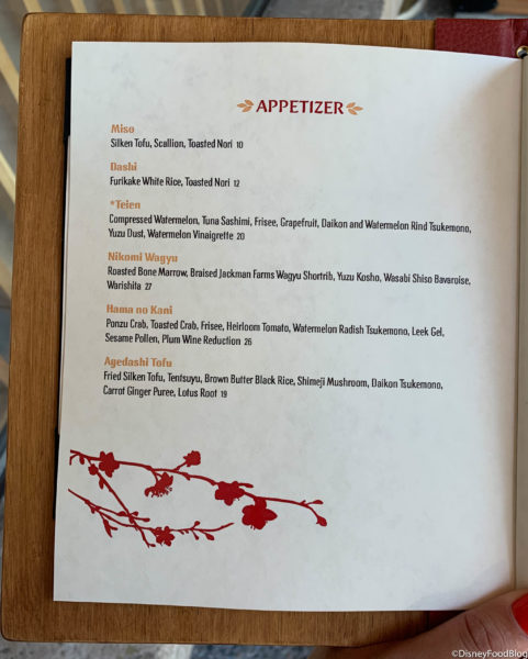 The space is beautiful. It absolutely doesn’t feel as though you’re in a theme park, and easily transports you to an understated and (do we say it?) zen atmosphere. Service is phenomenal. We were helped constantly by two cast members throughout the meal. One main server takes the orders and one sets and clears the table for each course. Both were very friendly and sweet, and were a great help in explaining the menu.