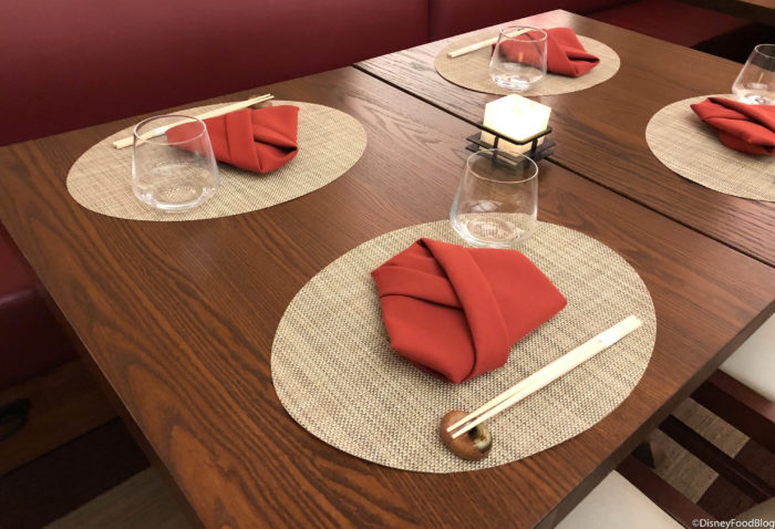 As you can see, place-settings all feature kimono-shaped red, folded napkins along with chopsticks placed on stone chopstick rests.