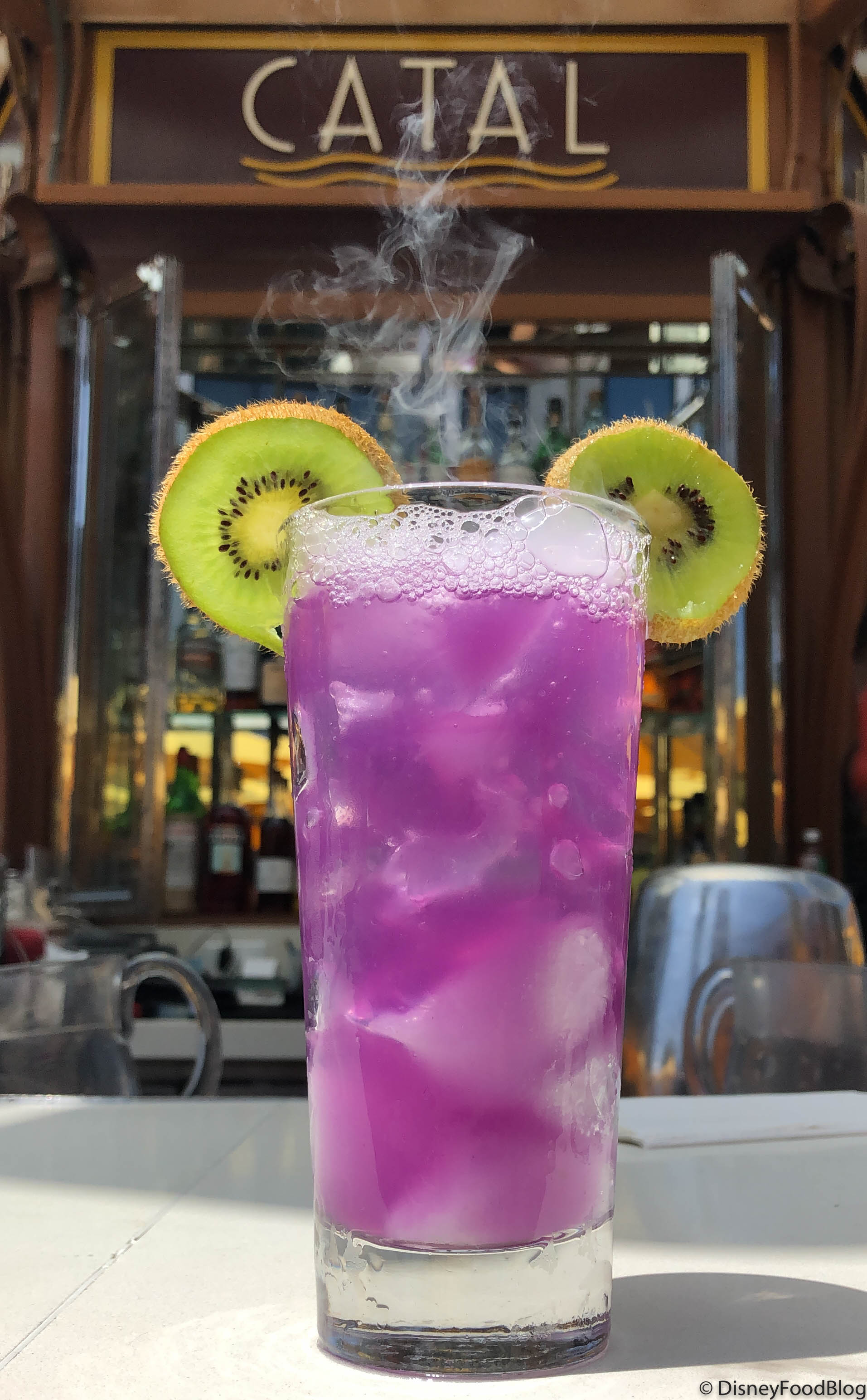 The Purple Galaxy Cocktail is a super-secret drink at Catal, located in Disneyland’s Downtown Disney District. The violet-hued drink consists of vodka, housemade limeade, and butterfly pea flower tea. Our bartender decided to get a little bit creative and added two kiwi wedges as Mickey ear garnish, but we’ve heard of others getting limes or lemons instead!