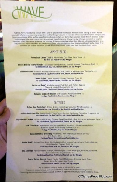 Allergy menus aren’t new, but while we were in the Contemporary, we stopped into The Wave to take a look at theirs. If you or your crew have concerns about allergens at The Wave, click the images below to enlarge them!