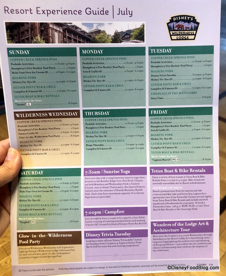 And we snapped a pic of July’s Resort Activities Guide. Click to enlarge if you’re heading to the Wilderness Lodge this month!