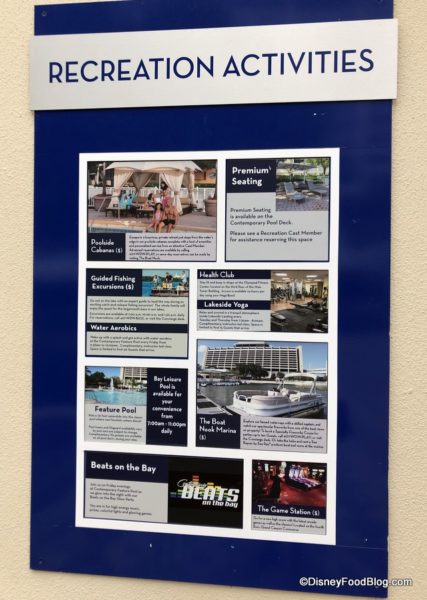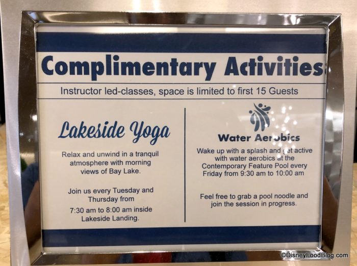 On a separate placard, we spotted Lakeside Yoga and Water Aerobics — both complimentary activities for guests but limited to 15 guests only.