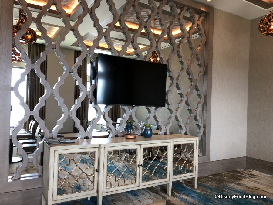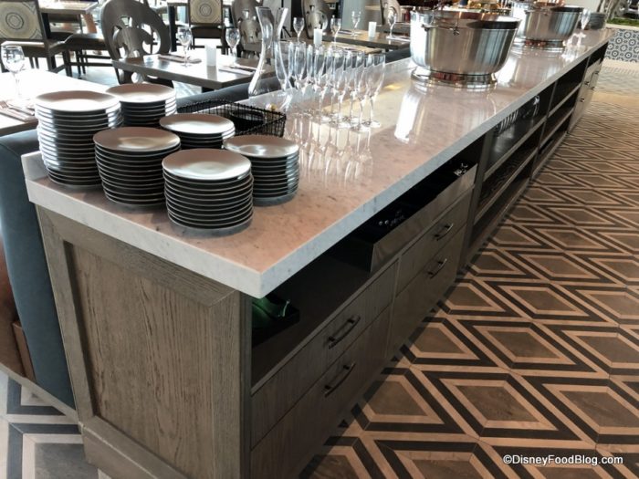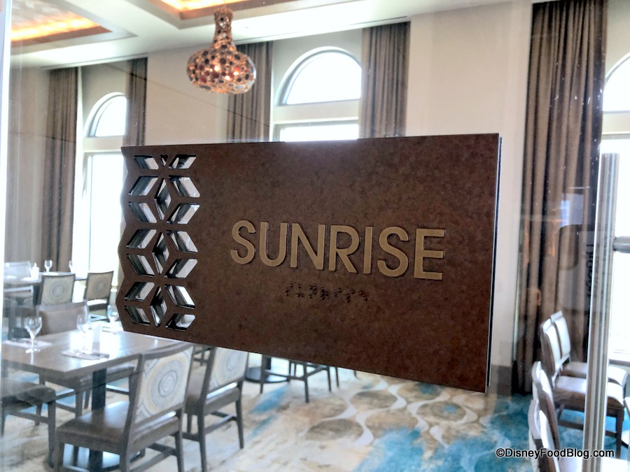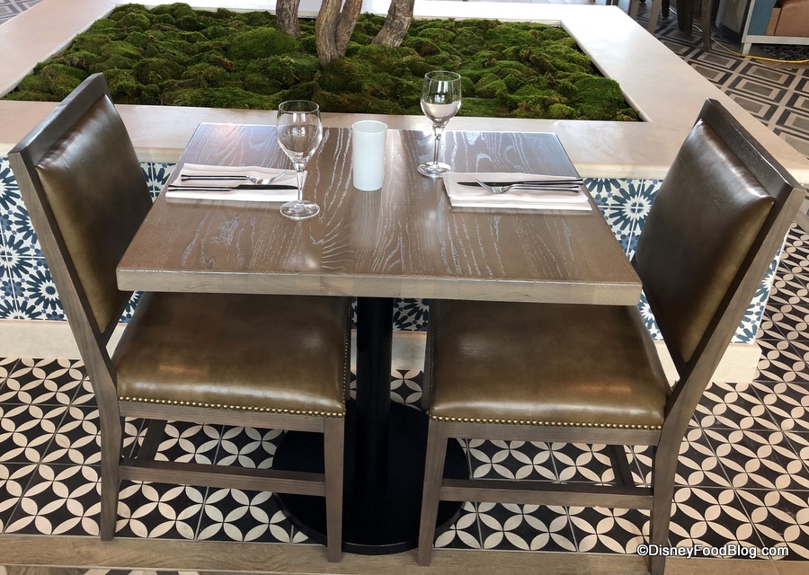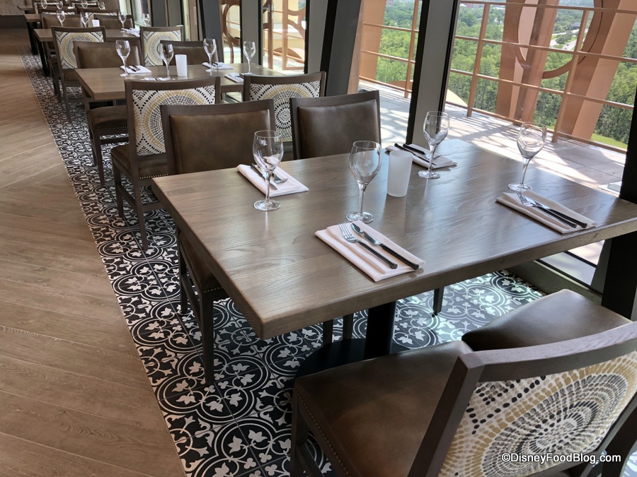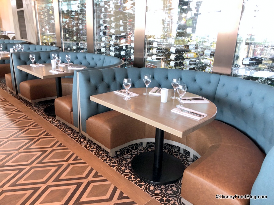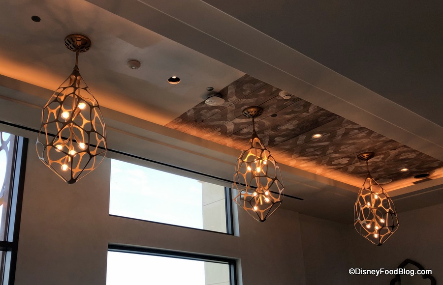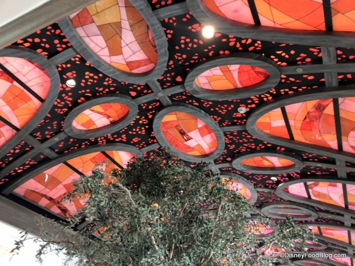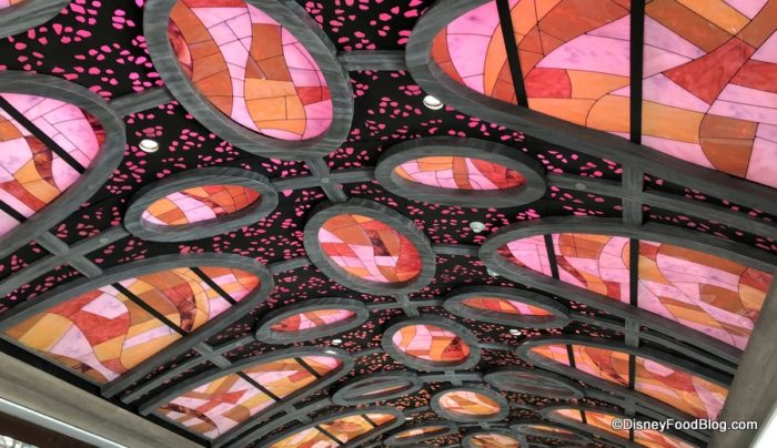 The vaulted ceiling gives the sense of an atrium, and we were told the backlighting of this ceiling can and will change (so it’s not all pink, all the time). (Remind anyone else of Enchanted Garden on the Disney Cruise Line — ayup.) In our full review, we’ll try to capture this effect and its impact on the mood of the dining space.