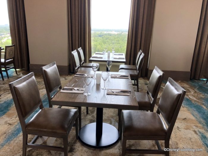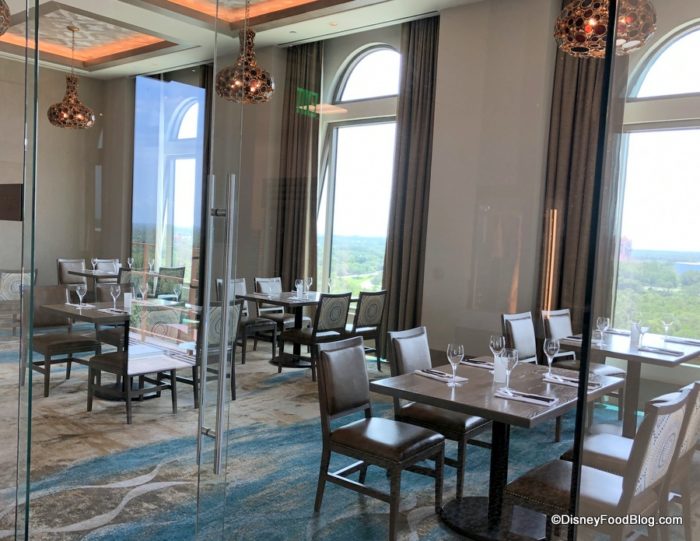 Because that altitude serves one spectacular purpose: to provide diners with one-of-a-kind views of Walt Disney World, including (when you time it just right!) glimpses of nighttime spectaculars at not one but TWO Parks! And the interior design and menu aren’t half bad, either. 😉