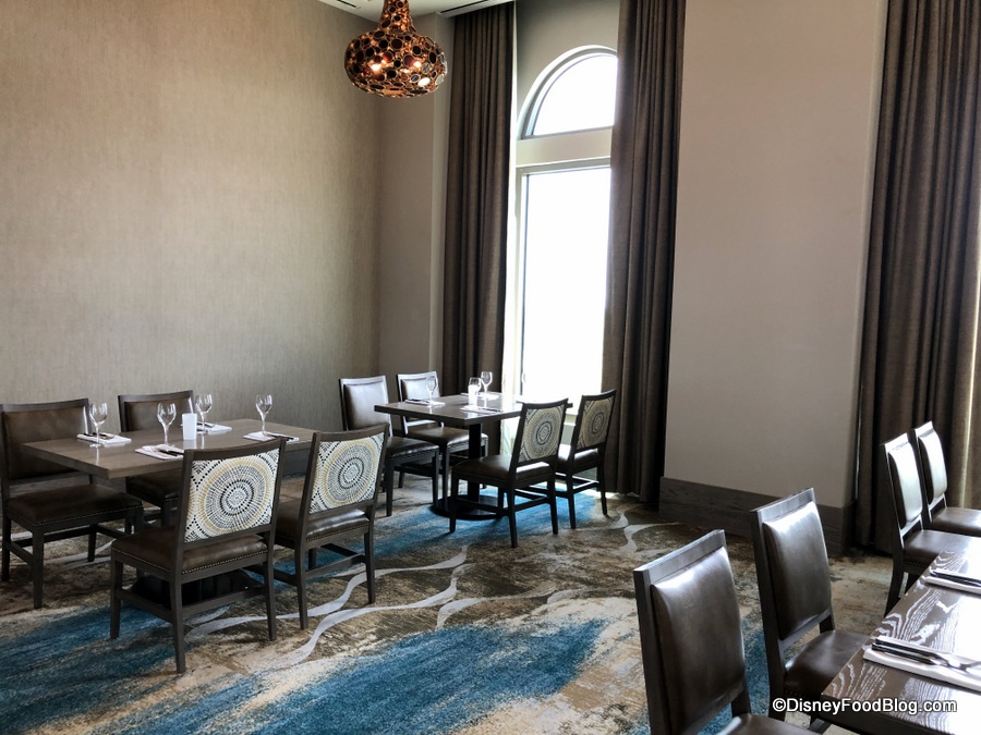 Also of note: Toledo has some private dining spaces. We stepped inside the Sunrise Room and found comfortable seating, lush window treatments, and beautiful glass light fixtures.