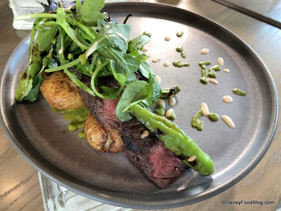 The Hanger Steak rests on crushed new potatoes and is vibrant with the greens of charred peppers and salsa verde.