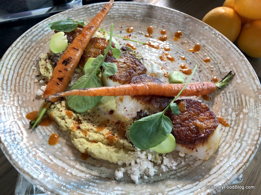 The Scallops come with fava hummus and feta powder (as well as some beautifully seared shellfish)!