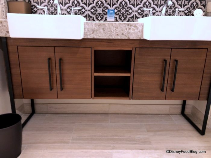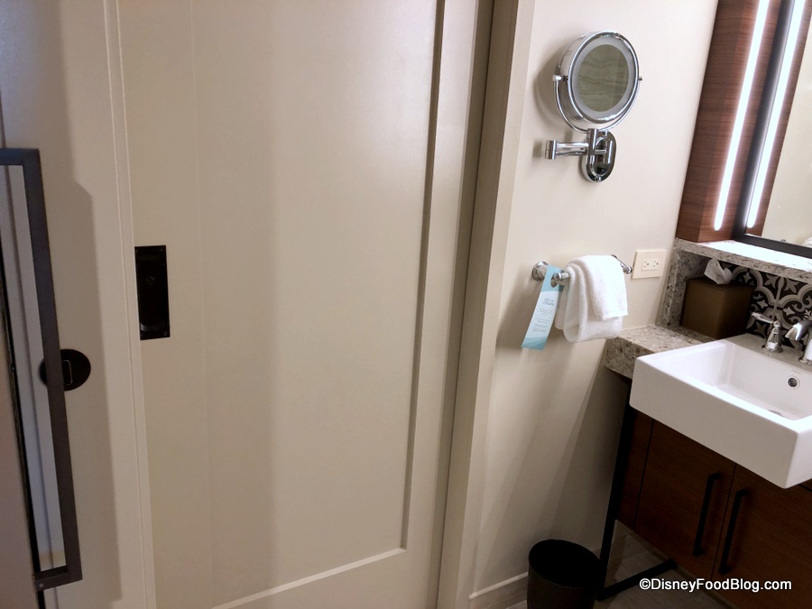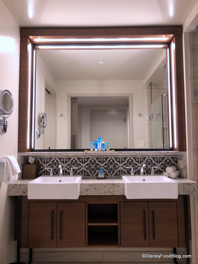 The double vanity consists of two separate sinks, granite countertops, Moorish-style tile backsplash, and a large mirror. As is the case at Contemporary Resort as well, there is PRECIOUS little counter space here. So families who are used to taking up plenty of space with their toiletries will need to downsize.