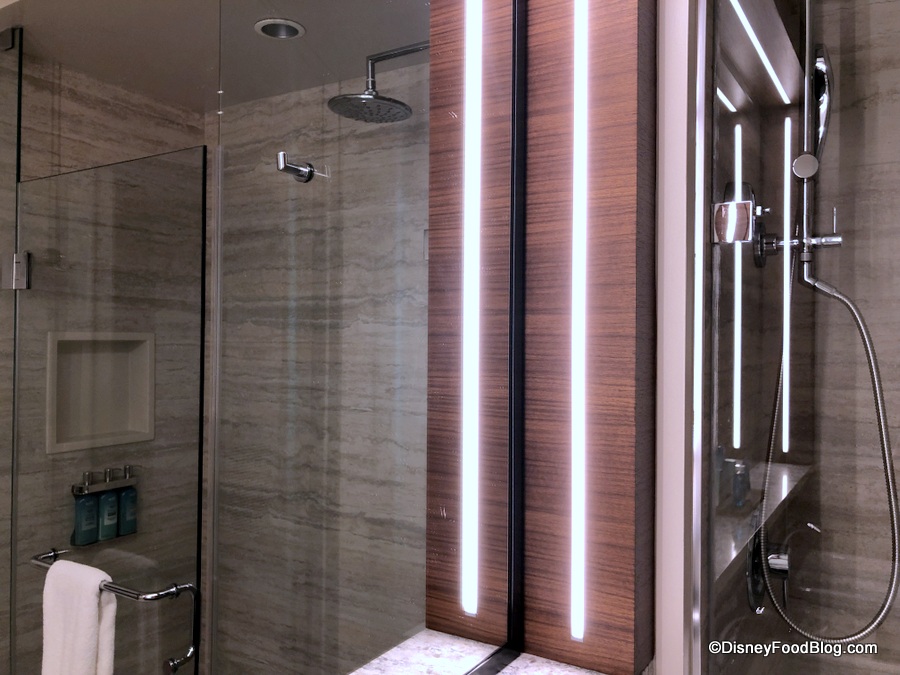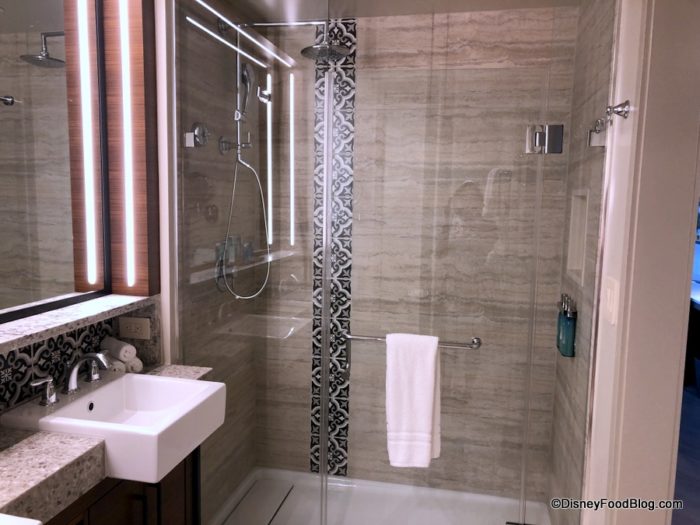 Note that there is no bathtub in these rooms. This is a direction Disney World has been going recently with its room renovations. It’s a little upsetting for families with small children who really do depend on those bathtubs to wash the little ones. But for business travelers, this is preferable most of the time.