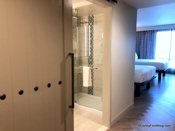 When entering the room, a sliding barn door conceals the entrance to the bathroom. It’s wood and metal details are in keeping with the Spanish modern design. This is the basic layout for Disney’s Contemporary Resort rooms, and don’t mimic Coronado Springs’ original rooms with a vanity area outside of the actual bathroom. This gives the rooms a more deluxe feel already.