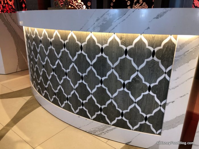The front desk area and concierge are anchored with marble desks studded with down-lit wood-style decorative tile. The backdrops are bright and sophisticated.