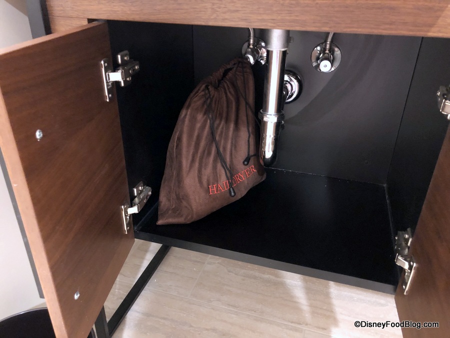 But storage beneath the sinks is generous. This is also where you’ll find the Conair hair dryer.