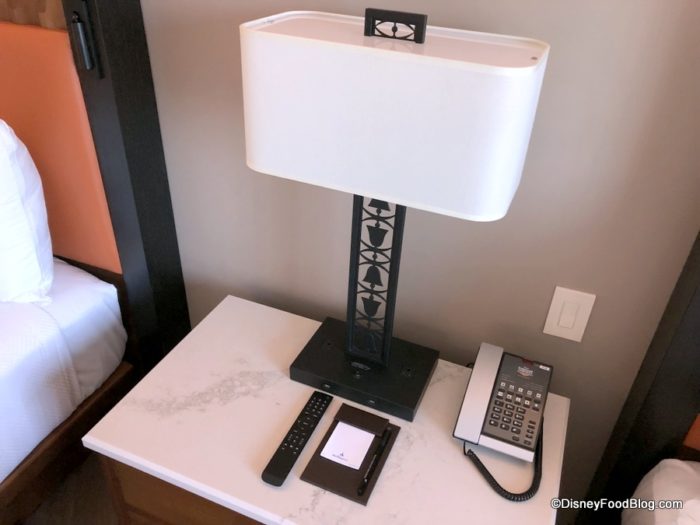 The shared side table features a large lamp, a phone, and other typical room essentials. Note that this lamp has two plugs AND two USB ports for nighttime (or naptime) charging.