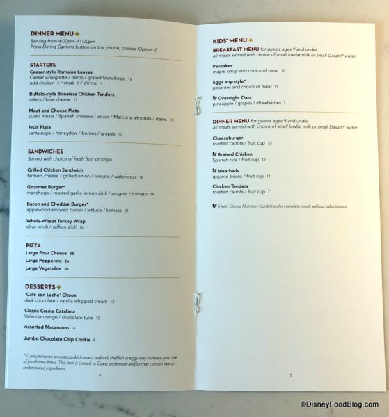 Dinner Menu options are distinct from the Tower’s restaurants and lounges, too. Items like a Grilled Chicken Sandwich and kids’ Chicken Tenders aren’t found elsewhere in the Tower. In fact, dining for kids is a little limited in the Tower, and this may be the only way to save yourself a walk (albeit short) to El Mercado.