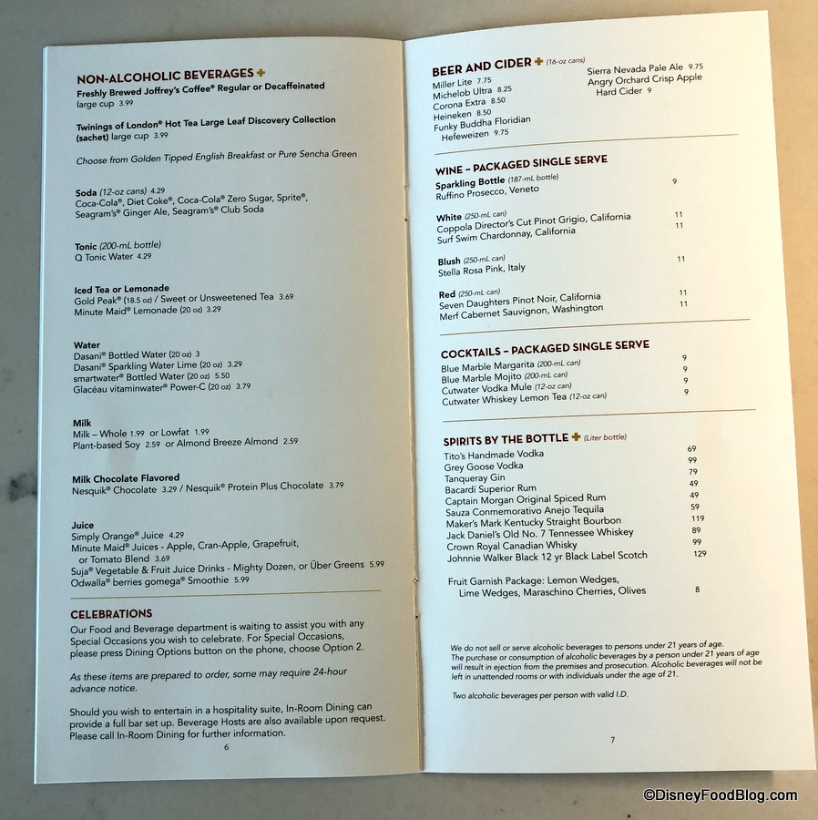 Beverages available via In-Room Dining include non-alcoholic options like coffee, iced tea, and soda. Beer and Cider, packaged single-serve Wine and Cocktails and Spirits By The Bottle are available, too.