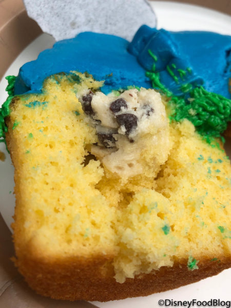 The yellow cake is very light and fluffy — actually, it’s so light that the icing made the entire cupcake overly top-heavy. As soon as we cut into it, the Elephant Cupcake fell right over. Maybe a little extra filling would have balanced it more (we just want more cookie dough).