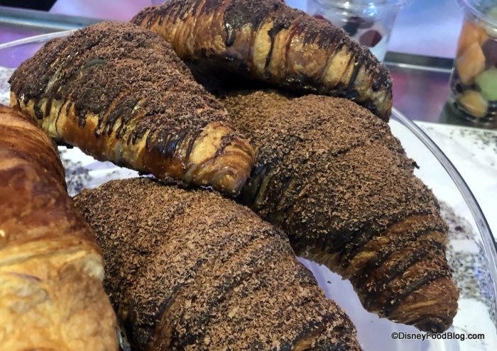 The Chocolate Croissant is covered in dark chocolate glaze and tons of chocolate shavings.