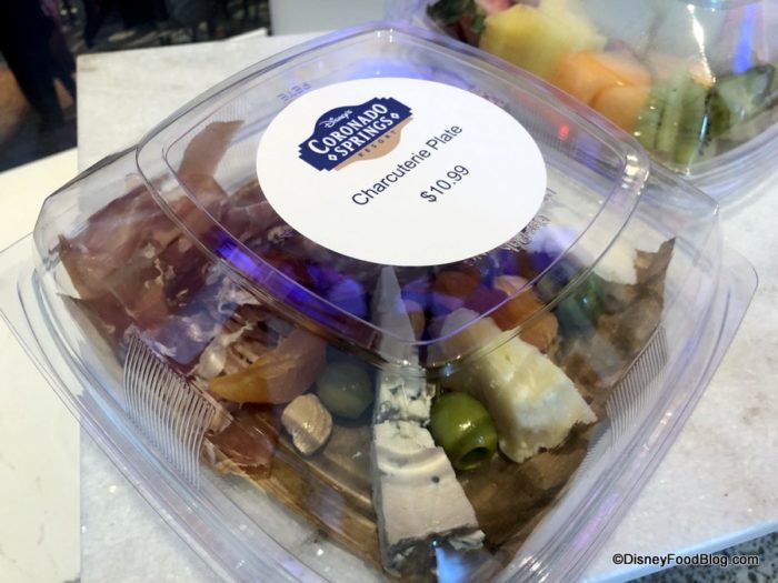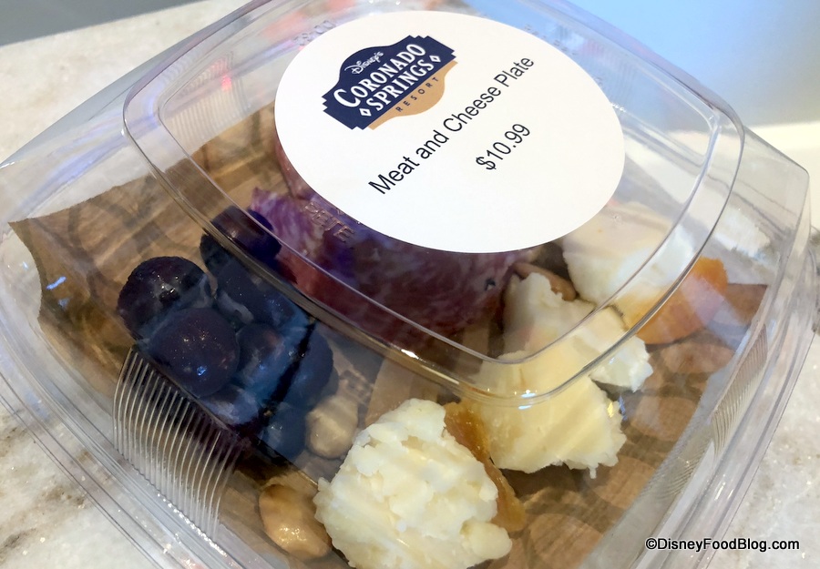 The Meat and Cheese Plate, like the others, will be kept in a cooler. This plate consists of various cheeses, cured meats, and complementary accompaniments like grapes and blanched almonds.