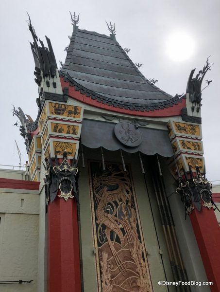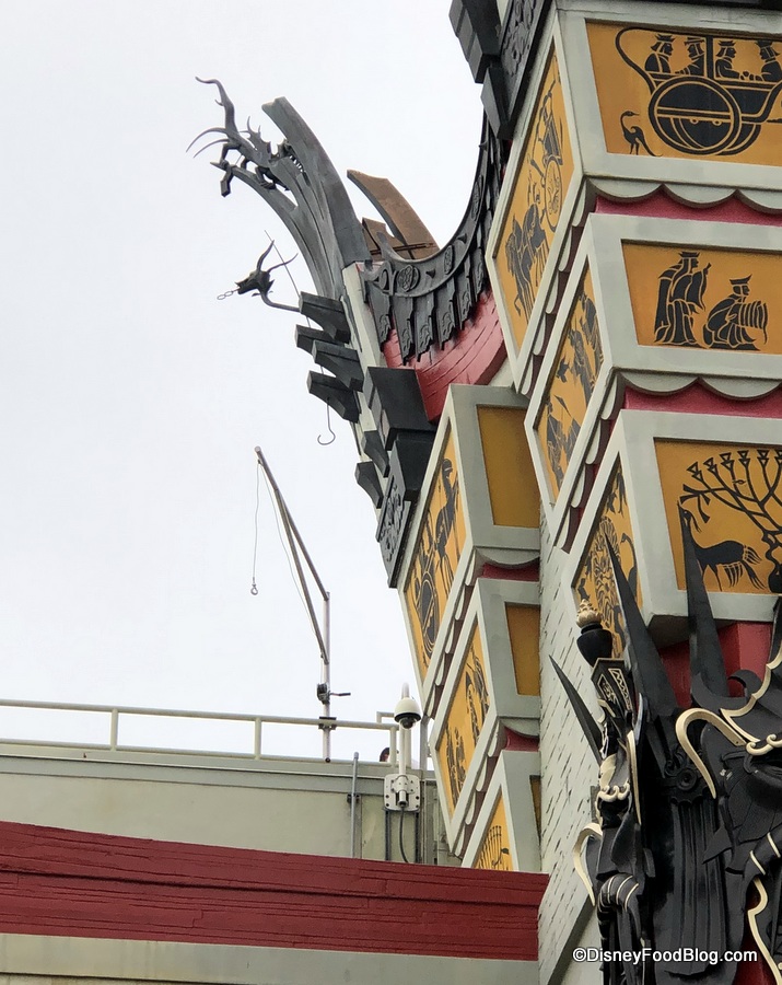 We’re not seeing much work on the Chinese Theater where Mickey and Minnie’s Runaway Railway will open next spring, but on this visit, we did spy a construction worker on the roof.