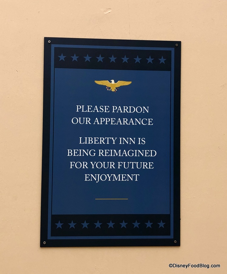 At the American Adventure Pavilion, Liberty Inn is officially behind construction walls as a refurbishment begins transforming the space into a BBQ joint called Regal Eagle Smokehouse: Craft Drafts & Barbecue.