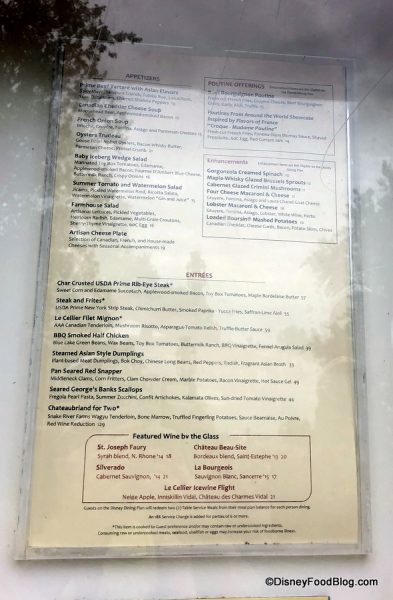 In Canada at Le Cellier, we noticed a few updates to the menu. The current World Showcase Poutine is Inspired by Flavors of France. It’s a remix on the Croque Madame so there will be an egg! Le Cellier has also added French Onion Soup, a Baby Iceberg Wedge Salad, and Summer Tomato and Watermelon Salad. Three menu items have returned: Artisan Cheese Plate, Maple Whiskey Glazed Brussels Sprouts, and Seared George’s Banks Scallops.