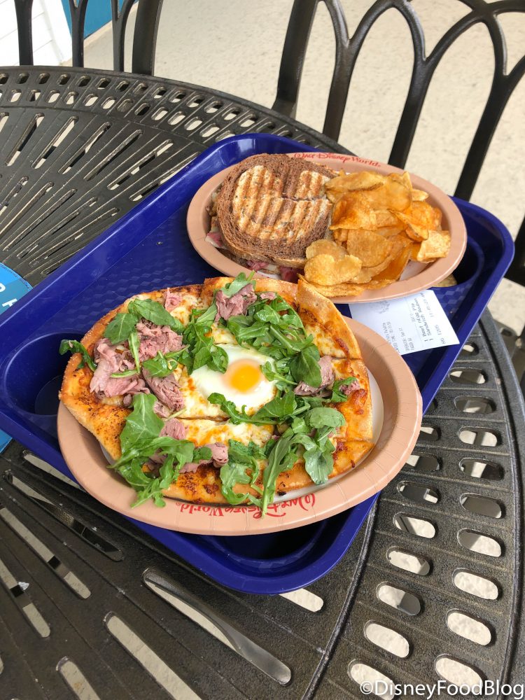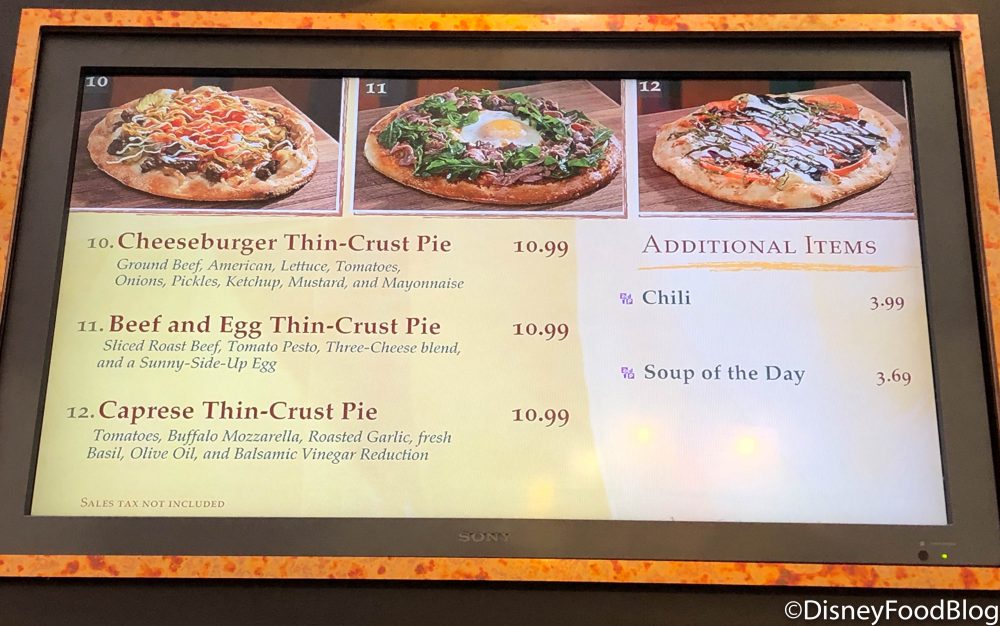 After deciding to go with the new Reuben Sandwich ($10.99) and the Beef and Egg Thin-Crust Pie ($10.99), we checked out at the cashier directly behind the counter-service area. We’d been at Artist’s Palette not long ago to check out that change to house-made pizza dough (read all about it here!); but the Beef and Egg pie was new since then, and we knew we had to try it!