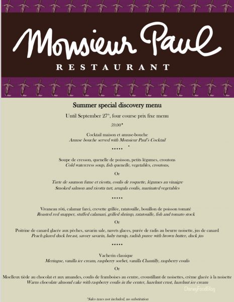 Starting this Friday and running through September 27th, guests will be able to sample the Summer Special Discovery Menu at Monsieur Paul, the signature restaurant in Epcot’s France. This high-end location specializes in authentic French cuisine passed down through the line of exceptional Chefs Bocuse!