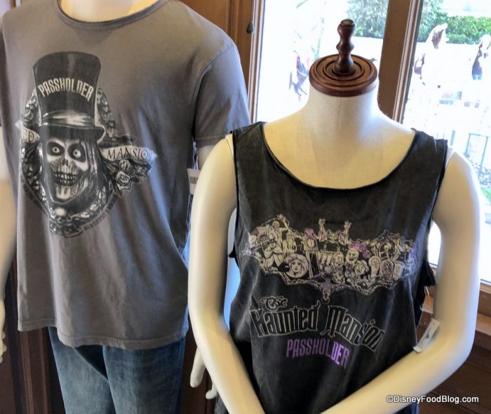 Disneyana in Disneyland Park has two Haunted Mansion Passholder-exclusive shirts on display. We love the tank with all those ghastly figures!