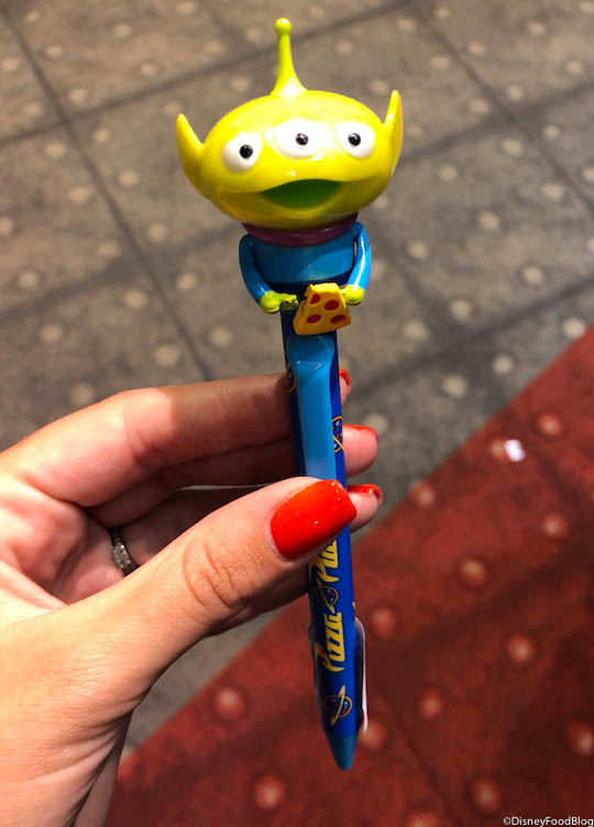The Alien pen is eating a pizza and has the Pizza Planet logo on it!