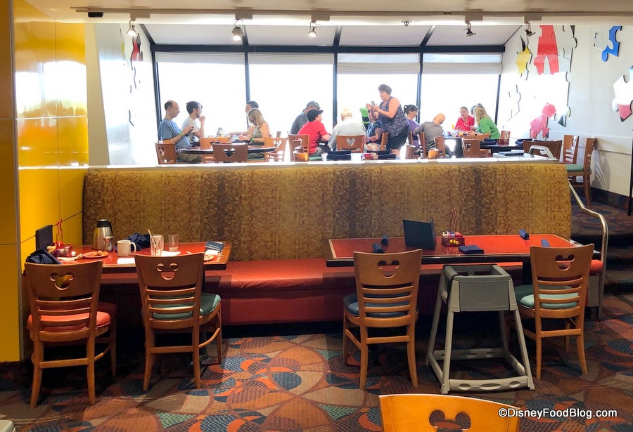 In 2018, the restaurant moved to a temporary location in the Resort’s convention center for maintenance; but only the kitchen underwent some work, so even that recent closure didn’t result in a refreshed dining space. Its contemporary design is circa the 1990s (it opened as Chef Mickey’s in 1995), but while “contemporary” should mean the style evolves with the times, that… hasn’t happened here.