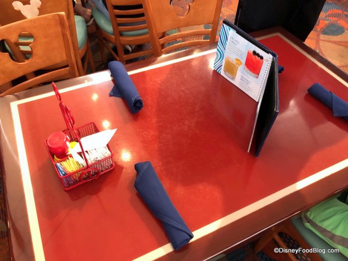 Table settings are simple, with silverware wrapped in blue napkins, the drink menu, and a seasoning caddy.