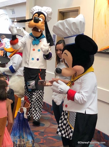 The real stars of the Chef Mickey’s show is the characters who circulate through the restaurant and stop to chat (and pose!) with their fans.