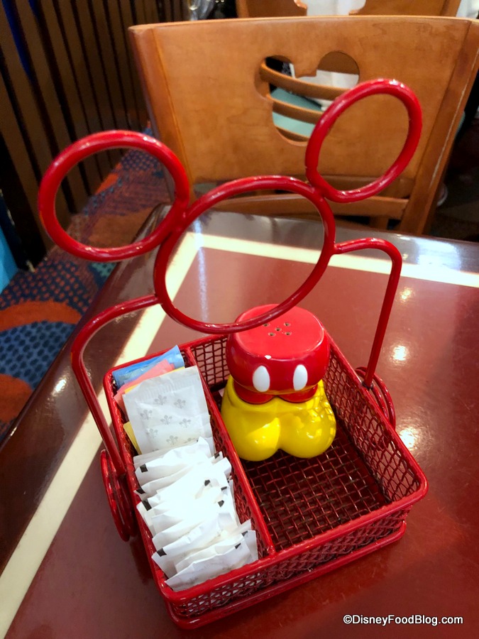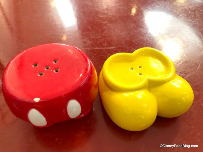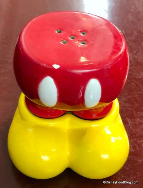The salt and pepper shakers are a lot of fun. They’re displayed like this. Pepper pants! Salty shoes! Sort of strange to shake seasoning from Mickey’s pants, but we’re here for it.