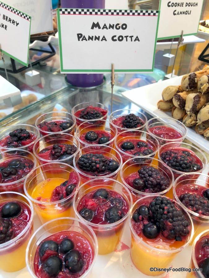 Mango Panna Cotta has a traditional panna cotta jiggle. We’re not fans of “milk jello,” but the flavor combo of mango and tart berries is a good one.