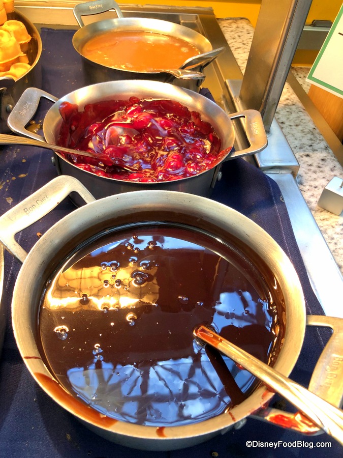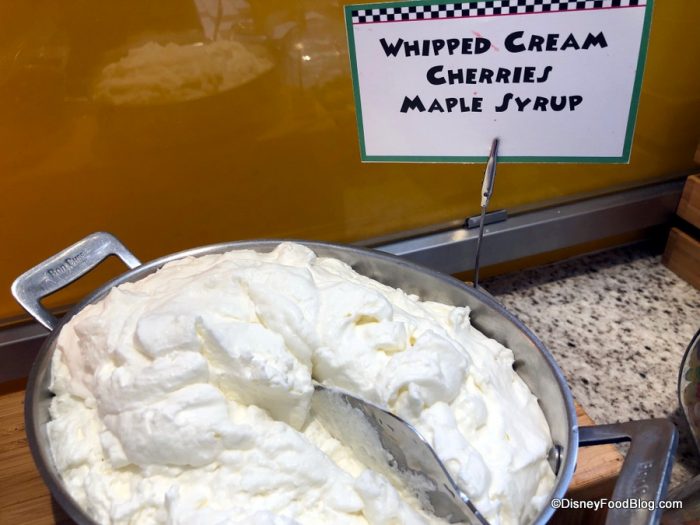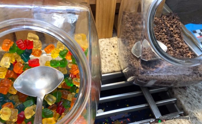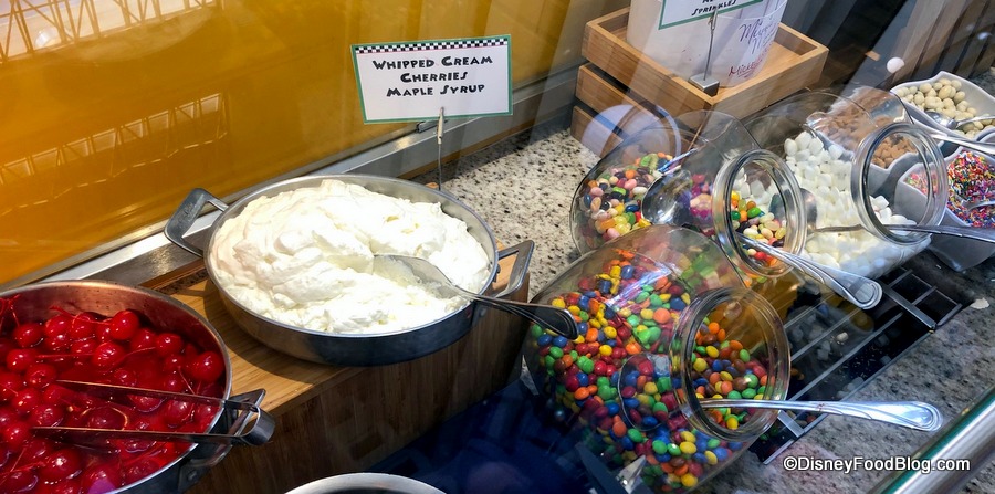 But we’re not done yet! There are also Sprinkles, Nerds, and more! And no: this is not an ice cream sundae bar; it’s all for the Mickey (and Minnie) Waffles! (Though the ice cream is right around the corner, so we won’t judge if you use it on that. Or, even better, add ice cream to your Mickey waffle and then go for the toppings!)