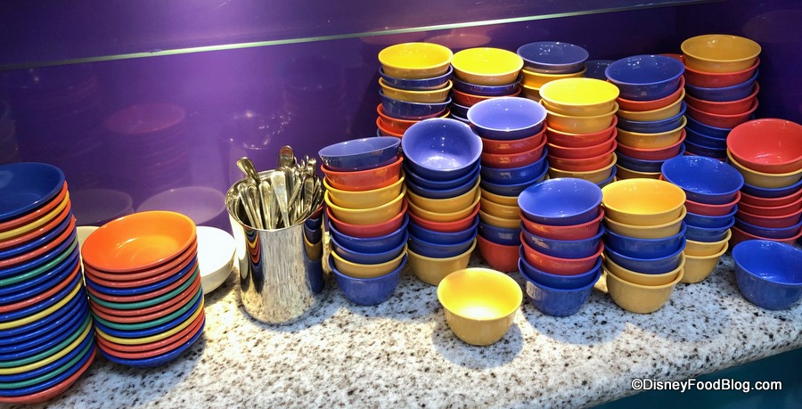 At the buffet, you’ll find the small plates, bowls, and large plates you need — plus additional silverware. These bowls are for the all-you-can-eat ice cream taps!