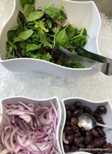 Mixed Greens, Red Onions, and Black Olives stand at the ready for a healthy buffet option.