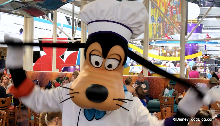 But whatever time you dine, Chef Mickey will be there for you, wearing his chef whites and stirring the pot of fun in the dining room.