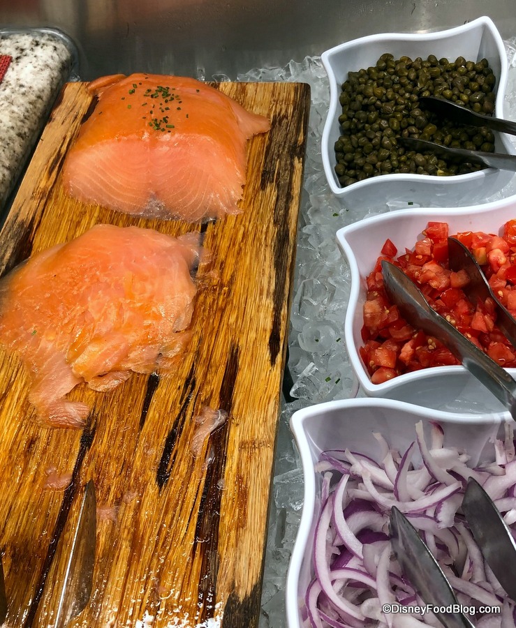 There are two preparations of Salmon on the buffet. This is lox-style and comes with traditional accompaniments like capers and onions.