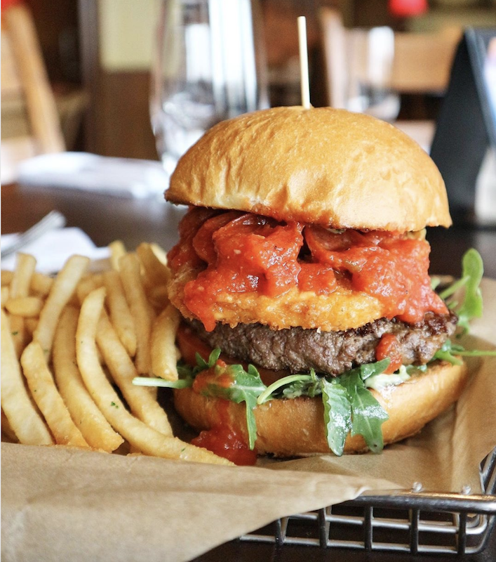 The burger is made of certified Angus beef, fried mozzarella, marinara jam, pepperoni, fresh arugula, and pesto aïoli, and is served with garlic fries!