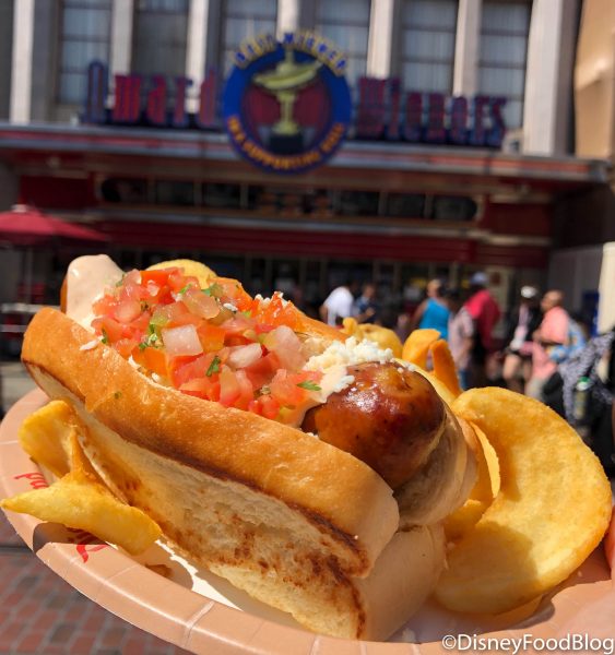 We noticed a returning hot dog on the menu at Refreshment Corner! The Philly Cheesesteak Dog is back for $12.99 before an Annual Passholder discount. The footlong hot dog is topped with thin beef slices, peppers, onions, and a cheddar cheese sauce, and served with a choice of apple slices or a bag of chips.