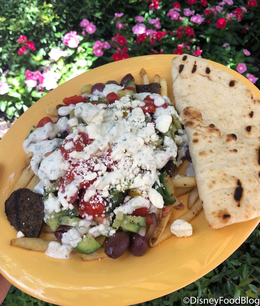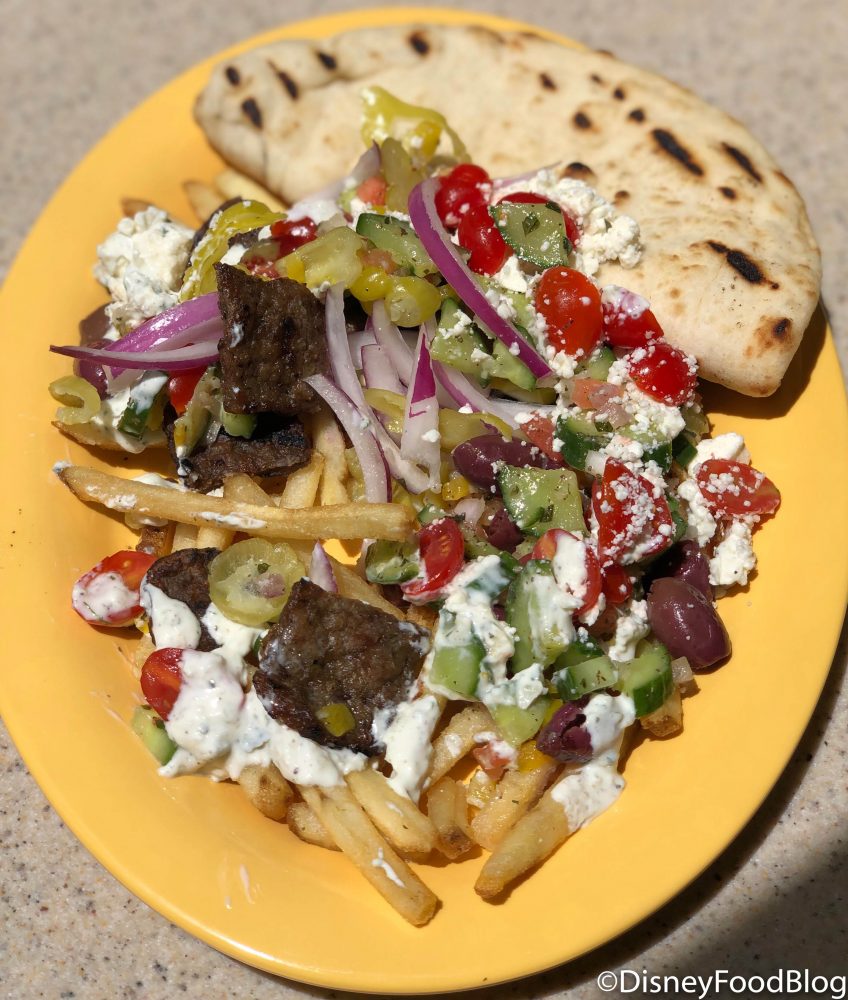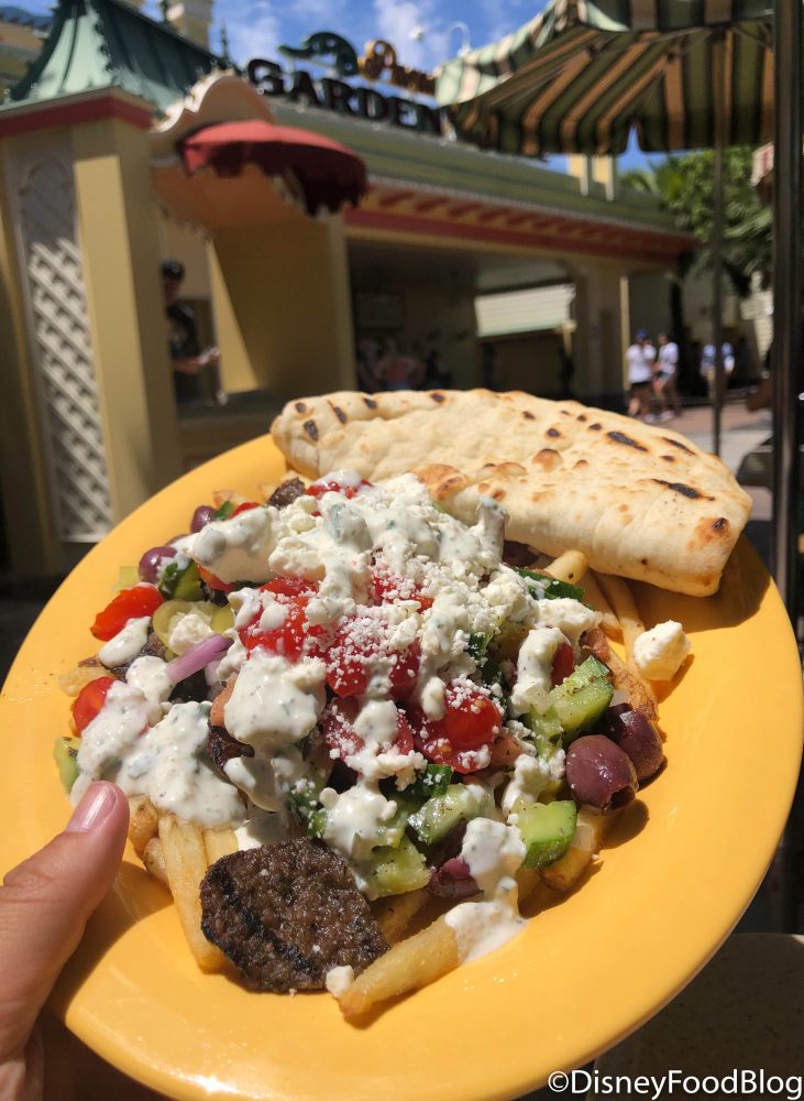Paradise Garden Grill in Disney California Adventure is now serving Gyro Fries and we couldn’t wait to try them! While we’ve previously tried the Beef Gyro Platter, this new menu item takes seemingly regular fries and sprinkles them with a little Mediterranean flavor.