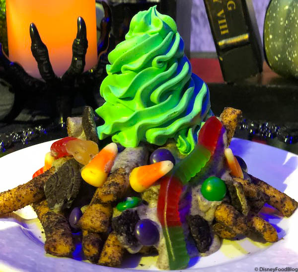 The NEW Oogie Boogie Funnel Cake Fries are dusted in crushed chocolate cream cookies. They’re topped with cream cheese sauce, chocolate cream cookie pieces, gummy worms, chocolate-coated candies, and whipped cream. We actually had the opportunity to give these guys a taste. And honestly, they reminded us of the Sorcerer Mickey Funnel Cake Fries!