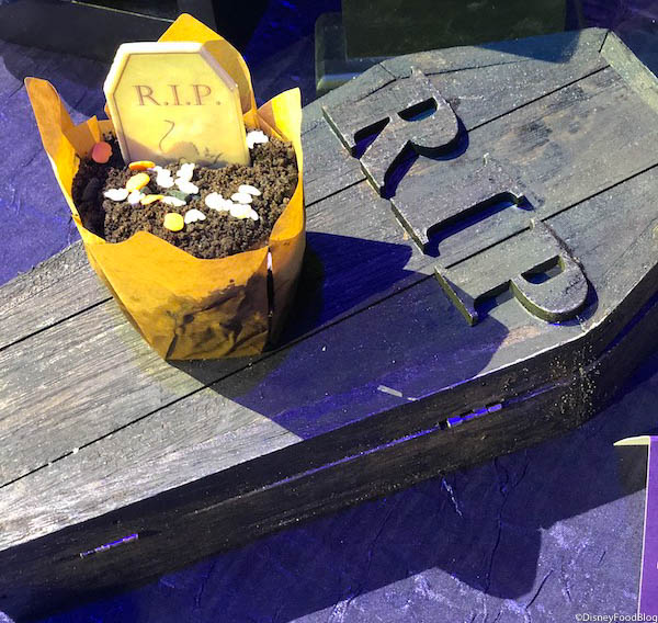 Another item returning for another Halloween season is the Graveyard Cupcake. It is a chocolate cake with cherry filling, dark chocolate mousse, cookie crumbs, Halloween sprinkles, and a tombstone chocolate piece. You can read our full review of the Graveyard Cupcake here and find it at Jolly Holiday when you’re in the Park!