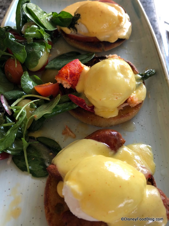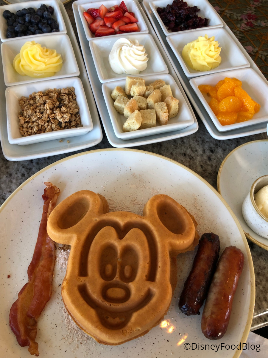 Or for an even more kicked-up brunch, enjoy the upgraded Mickey Waffles! These aren’t just your regular Mickey-shaped waffles. Your upgrade includes a specialty syrup and three additional toppings combinations to choose from such as sugar cookie crumbles with whipped cream, strawberries and strawberry sauce, or mandarin oranges with chantilly cream, craisins, and citrus-pecan syrup just to name a few!