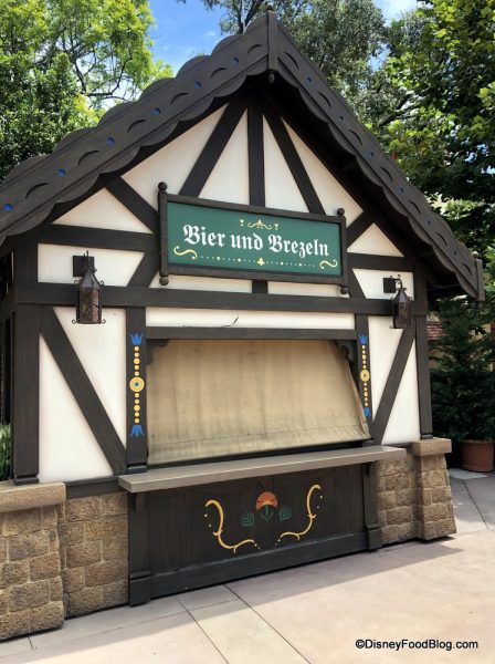 In the Germany Pavilion, the beer and pretzel booth (which will be used for the Food and Wine Festival) was closed when we were there, but the beer and pretzel cart is back!