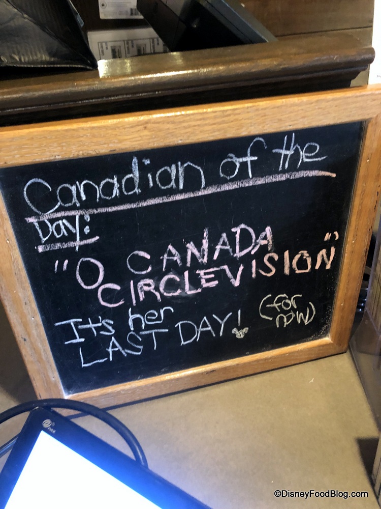 In the Canada Pavilion, Northwest Mercantile’s sign by the registers honored O Canada‘s last day before its temporary closure. In case you missed it, O Canada has temporarily stopped running as a new film is created for the attraction. During Epcot’s International Food and Wine Festival, the O Canada theater will serve as an air-conditioned space to relax.