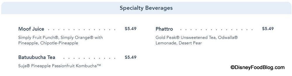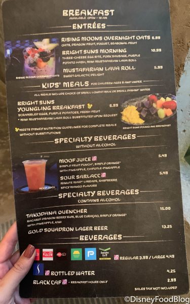 Just so you know, two beverages currently listed on Disneyland’s menu were not on the menu in Hollywood Studios — Phattro and Batuubucha Tea. Also, the Sour Sarlacc was listed on Hollywood Studios’ menu when we were there, but it is not currently listed on Disneyland’s menu. Since Disneyland’s Docking Bay 7 does not serve alcoholic beverages, you’ll only find the Gold Squadron Lager Beer and Takodana Quencher in Hollywood Studios.
